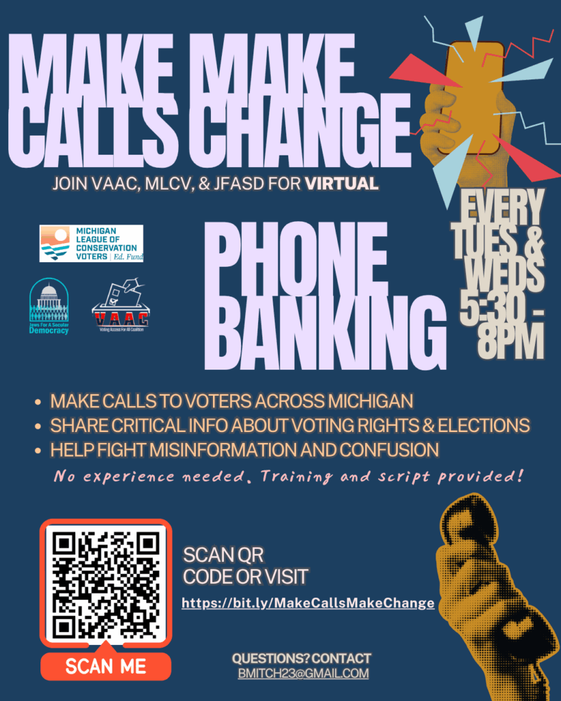 Phone bank with VAAC, Michigan League of Conservation Voters, and Jews for a Secular Democracy every Tuesday and Wednesday from 5:30–8 PM. We’ll connect with Michigan voters, share accurate information about voting rights, and cut through confusion so every voice is heard. Training and a script are provided—new and returning volunteers are welcome.
