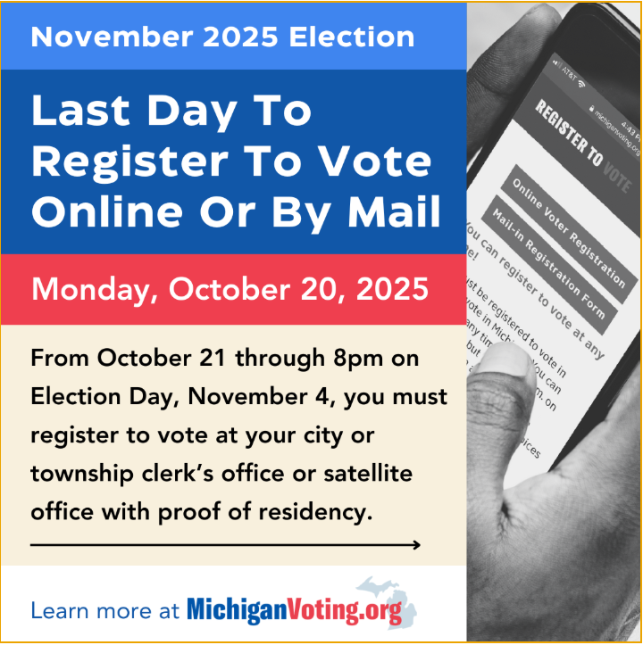 Michigan’s 11/4 General Election is fast approaching—now’s the time to register, plan, and vote early to ensure your voice is heard. Key deadlines are coming up for registration, absentee ballots, and early voting, with new opportunities across the state to make participation easier than ever.