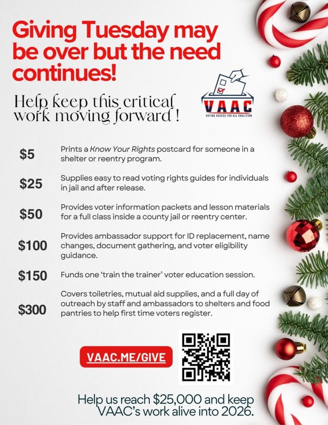 Right now there is still time to make a meaningful impact before the year ends. Your support ensures that people impacted by incarceration have the information and resources needed to participate fully in civic life. When people understand their rights and have a path to the ballot they can advocate for the changes their communities need.