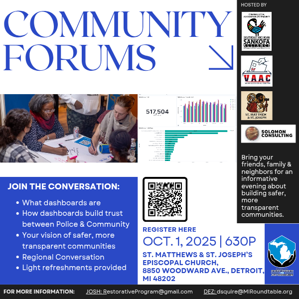 These events—organized in partnership with Michigan Roundtable, SE Michigan Sankofa Alliance, St. Matthew & St. Joseph’s, and Solomon Consulting—are spaces for learning, listening, and collective visioning. Together, we’re reimagining systems that truly serve and protect.