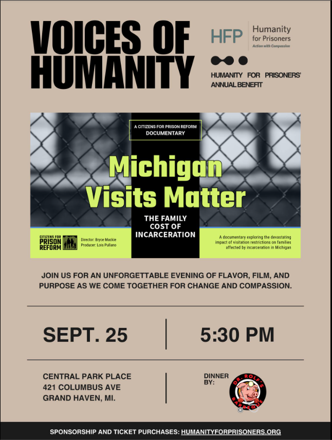 Guests will enjoy dinner from Dr. Rolf’s Barbeque, followed by the premiere of Michigan Visits Matter: The Cost of Family Incarceration. Produced by Citizens for Prison Reform, this moving documentary sheds light on the harm caused by restrictive visitation policies across Michigan’s prisons.