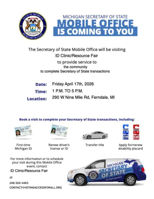 The Michigan Department of State Mobile Office will be on-site. The full cost of state IDs only will be covered for those who qualify.