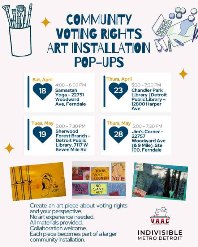 Voting Access for All Coalition (VAAC), in partnership with Indivisible Metro Detroit, is hosting a series of community pop-ups where participants contribute to a collaborative Voting Rights Art Installation.