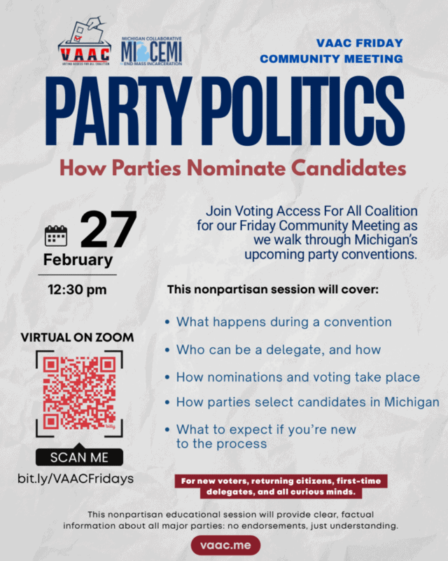 Join VAAC and MI-CEMI next Friday, February 27th for a meeting focused on increasing public understanding of Michigan’s party convention process and candidate nomination systems.