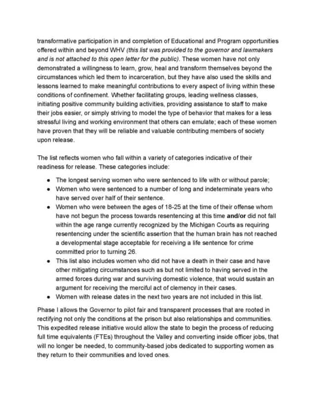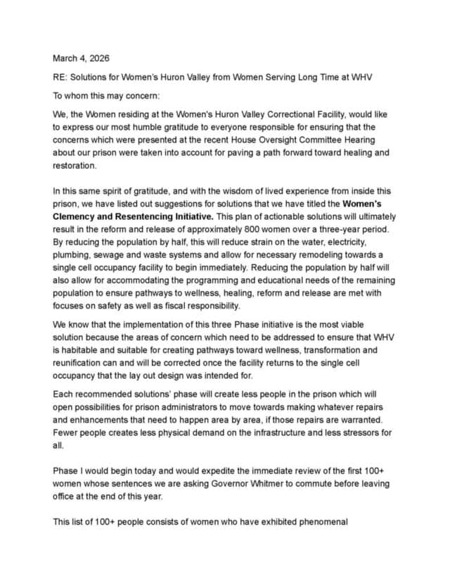 Women incarcerated at Women’s Huron Valley Correctional Facility have issued a solutions-driven open letter calling on Governor Whitmer to grant clemency to at least 100 women before the end of her term. The women are recommending the Women’s Clemency and Resentencing Initiative, a three-phase plan developed by women inside WHV that would: