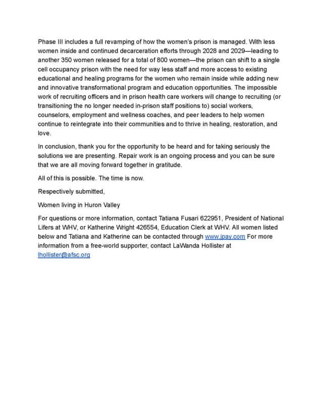 Below is the full letter from women at Women’s Huron Valley Correctional Facility.