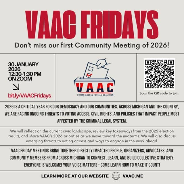 2026 is a critical year for our democracy and our communities. Across Michigan and the country, we are facing ongoing threats to voting access, civil rights, and policies that impact people most affected by the criminal legal system.